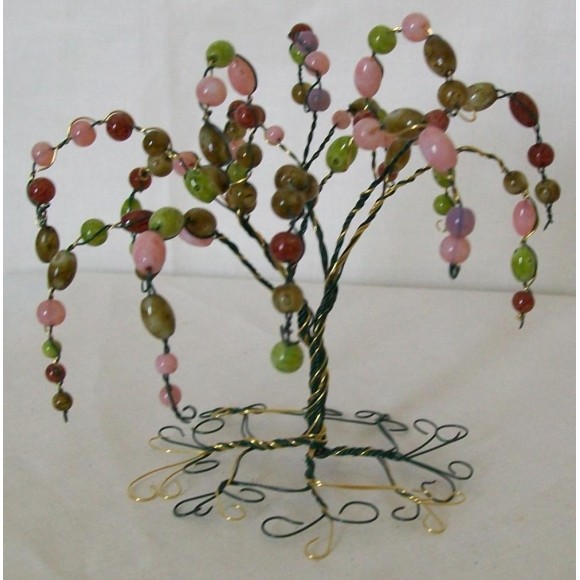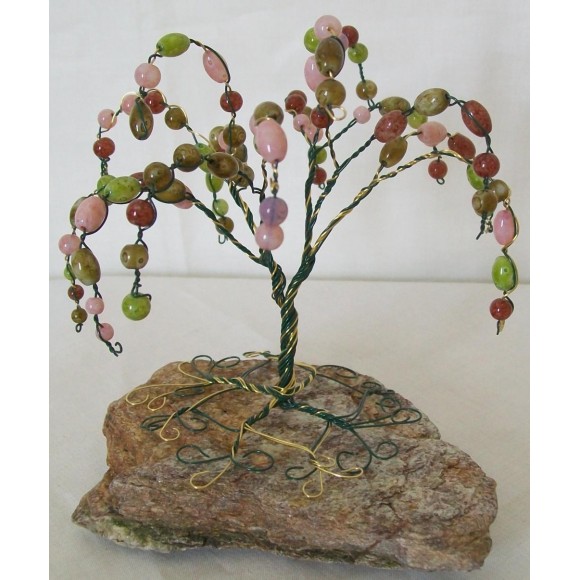 Weeping Stone Wire Tree Design has been twisted on a blend of green and gold wire.  The stones in this design are in various pink, maroon and green shades and shapes. Weeping Stone has the shape of a willow tree.